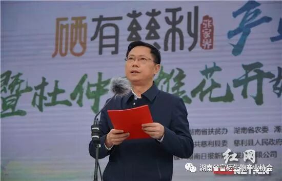 慈利县委书记邱初开在启动仪式上代表中共慈利县委县政府和全县71万慈姑儿女,向各位媒体朋友的到来表示热烈的欢迎,向一直以来关心支持慈利县脱贫奔小康事业、“硒有慈利”品牌建设和慈利经济社会发展的各级领导、社会各届人士表示衷心的感谢。邱初开指出,慈利县正在实施杜仲第二次创业计划,助力脱贫攻坚,计划三年新增杜仲面积10万亩,力促杜仲产业振兴,重现杜仲产能巅峰,再造一个优美慈利。2018年,整合1.1亿元产业扶贫资金,大力建设特色产业基地,全县3万多名贫困人口和70多个贫困村将从中受益,实现脱贫致富。慈利县将依托江垭杜仲种植基地,积极筹划建立“杜仲健康文化产业园”,努力促使慈利杜仲附加历史、文化、旅游、康养等诸多元素,精心构筑多点支撑的产业格局,为推动乡村振兴、打好“三大攻坚战”、实现经济强县梦全面小康梦撤县设市梦奠定更加坚实的经济基础。邱初开希望,各位媒体朋友借助这次采风活动,亲身感受慈利的旖旎风光、淳朴风情,用敏锐的眼光、独特的视角,把慈利最美、最好的东西摄入镜头、流入笔端,让世界知晓慈利,让慈利惊艳世界。